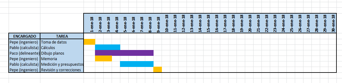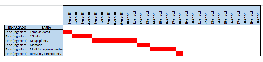 Existen multitud e infinidad de herramientas online, gratuitas y de pago para realizar diagramas de Gantt (dos de las más utilizadas son Microsoft Project (Windows) y OmniPlan (IOs). Se puede partir de una sencilla hoja de Excel e ir rellenando celdas para dibujar tal diagrama como en el ejemplo que se realiza a continuación.