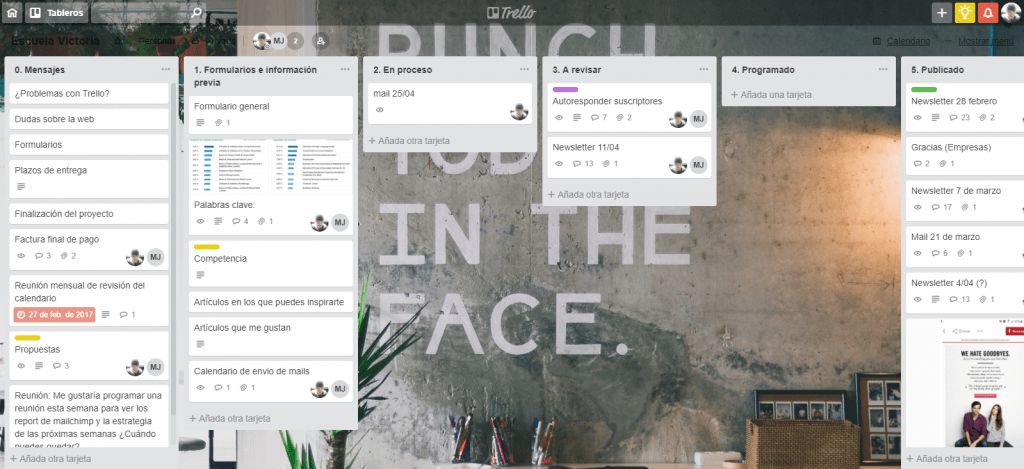 Tengo creado un tablero para cada empresa o cliente con el que estoy trabajando. En ese tablero tengo diferentes listas: Mensajes, formularios, En proceso, A revisar, programadas etc…